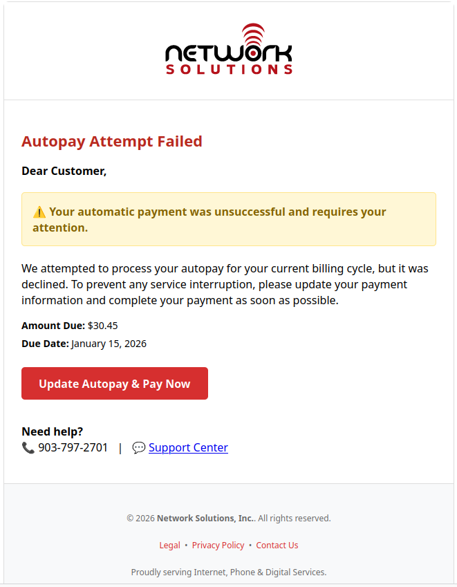 January 15, 2026 – We’ve been seeing some phishing attempts targeting our customers with emails using our logo on an autopay failure notification. Here is an example of what it looks like: